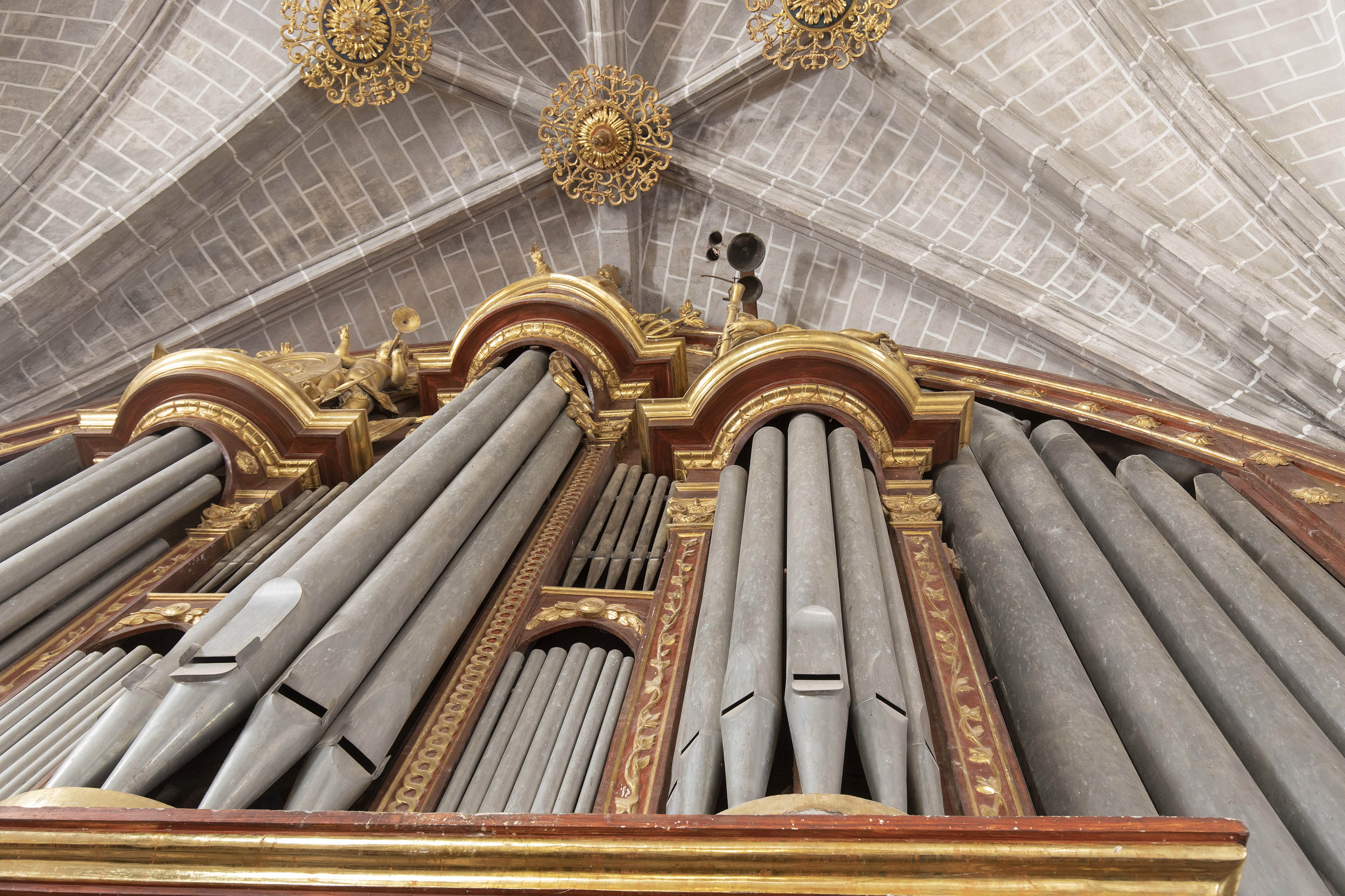 Esta fachada principal se articula en dos tramos diferenciados por la disposición de los vanos. En el primer tramo hay tres ventanas en arco de medio punto, apeadas en columnas con capiteles y ábacos, distribuidas en dos niveles distintos, ya que los dos vanos inferiores se corresponden con el nivel de las ventanas superiores del ábside, mientras el vano superior aparece centrado entre las dos inferiores. El segundo tramo presenta una ventana de características similares, pero situada a un nivel más bajo.